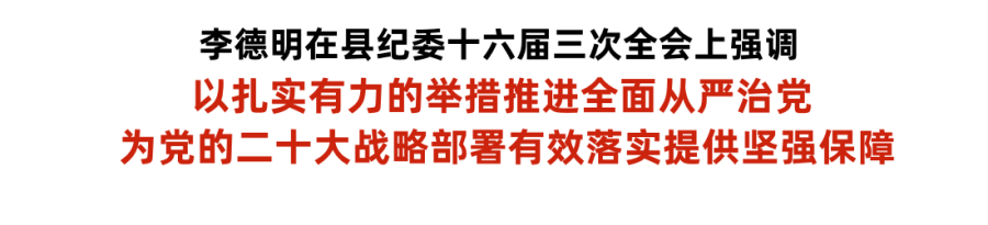 在肯定去年我县全面从严治党工作后,李德明强调,要立足大局、把握大势,以扎实有力的举措推进全面从严治党。要切实加强政治建设,确保党的二十大战略部署精准落地。要持续深化作风建设,巩固拓展落实中央八项规定精神成果。要加强纪律建设,引导党员干部牢固树立党章党规党纪意识。要深化标本兼治,坚决打赢反腐败斗争攻坚战持久战。要深化改革创新,着力构建系统完善的监督体系。